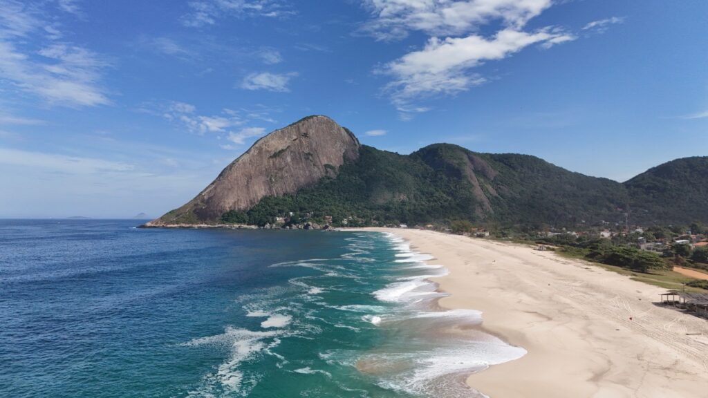 A Praia do Recanto nasce como um trecho da costa de Itaipuaçu, abraçada pela Pedra do Elefante ao fundo, e se desenvolve com uma faixa arenosa razoavelmente extensa. Há um píer de pedras (quebra-mar) que avança mar adentro, formando um prolongamento rochoso visível. A areia tem textura relativamente grossa, menos aderente ao corpo, e quiosques improvisados de moradores estão distribuídos ao longo da orla